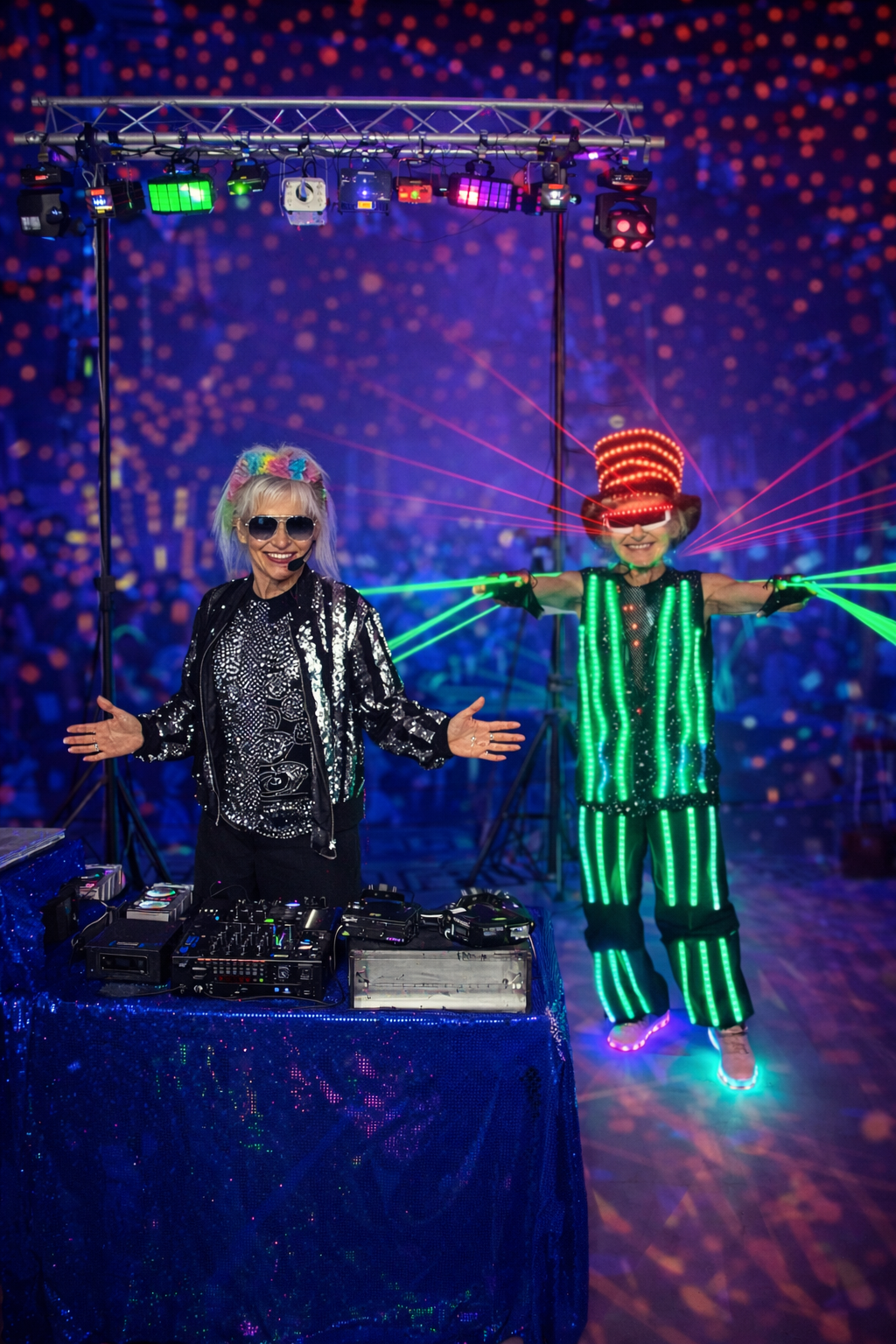 Eva spectacles est une femme DJ professionnelle pour tout public et tout âge vêtue d'un costume lumineux à LED.